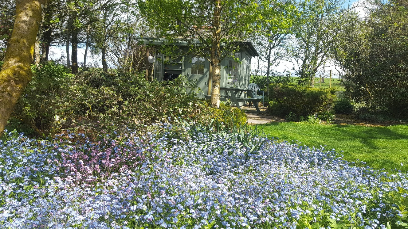 The Summer Howf got a make over and we are delighted with the results – a different colour outside, lovely tiles on the floor inside, painted throughout, new curtains, bits and pieces. A blanket of forget me not is out in front of it and it looks great.